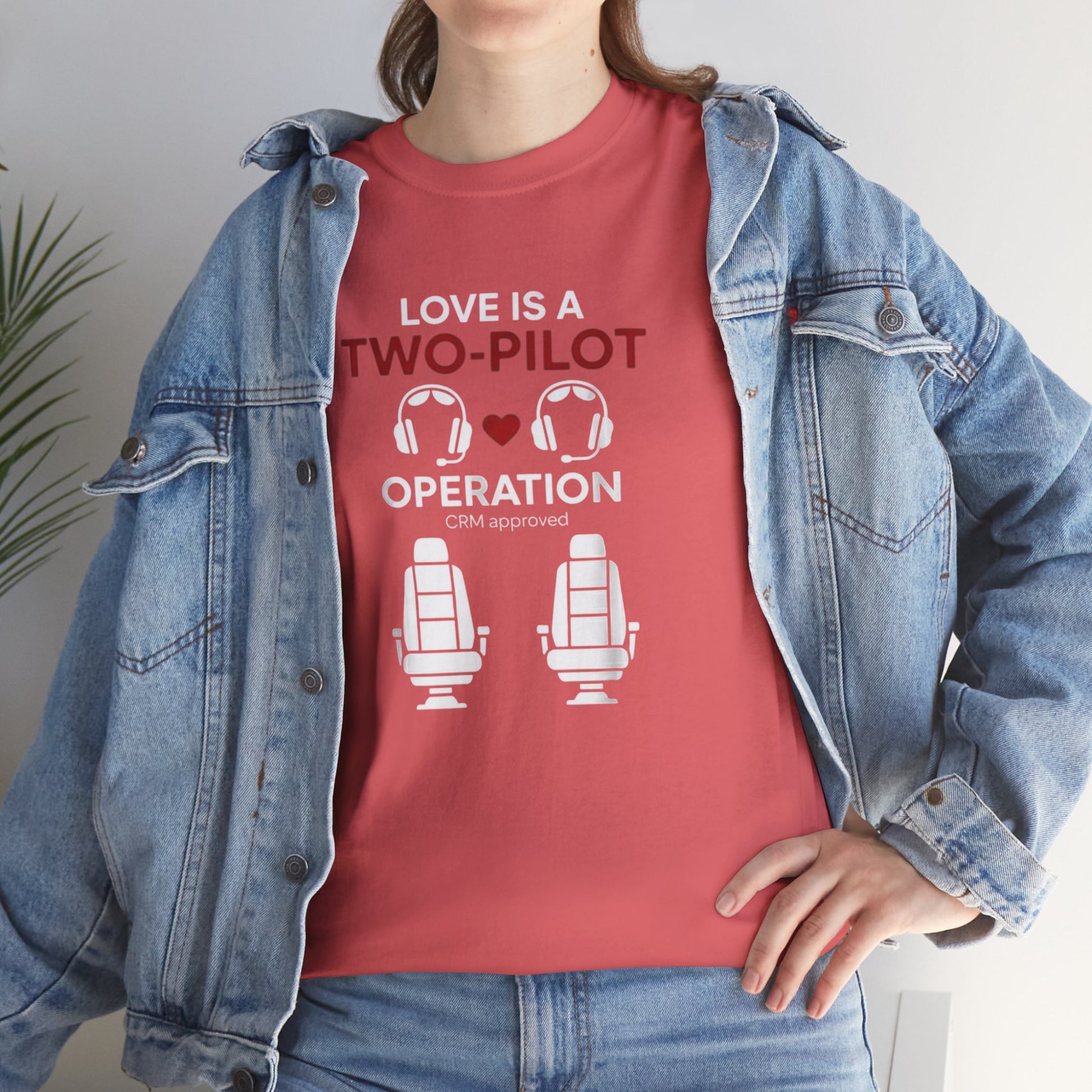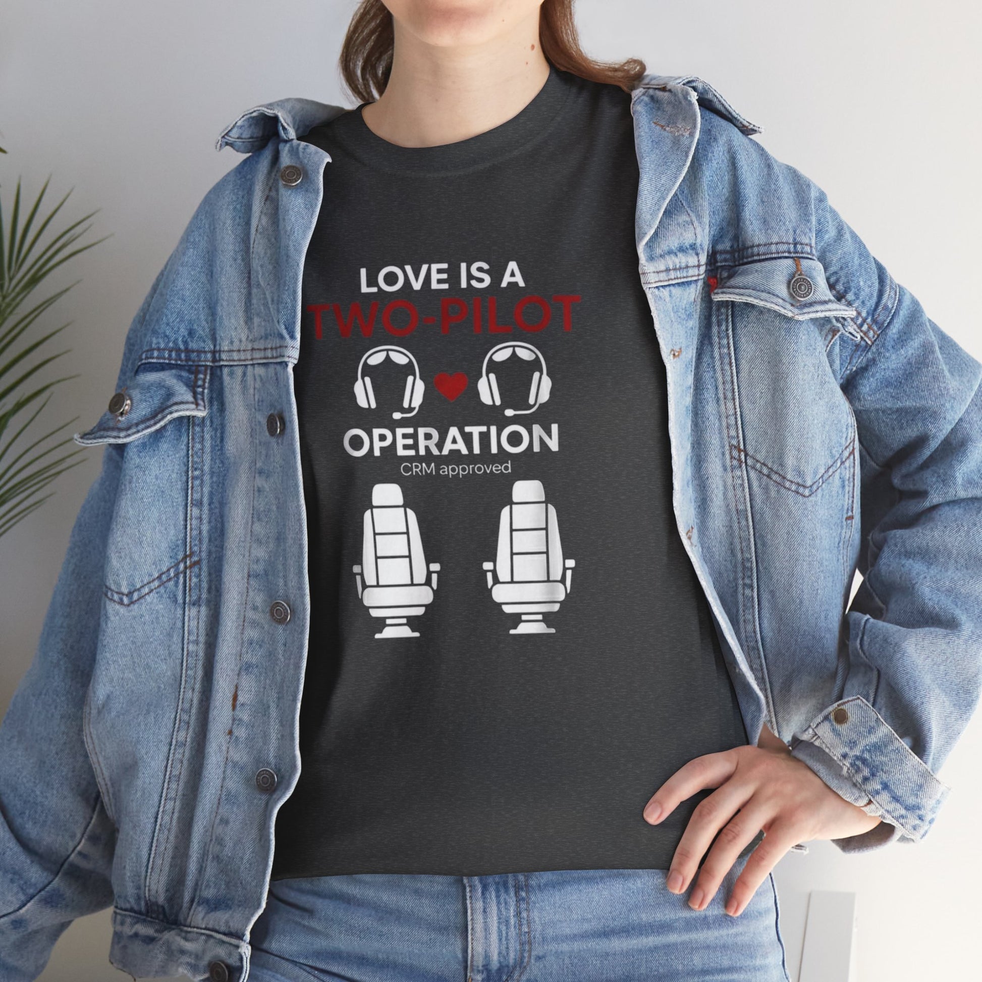 - Design: Clean aviation typography with the phrase “Love Is a Two-Pilot Operation” and subtle subtext “CRM approved”. Minimal heart or headset detail.